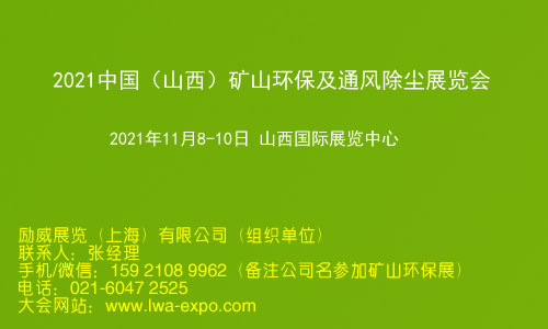 我們特于2021年11月8-10日在中國(太原)煤炭交易中心-山西國際會展中心舉辦“2021中國(山西)礦山環保及通風除塵展覽會”,本展屬同期綠色礦山展子展,由勵威展覽(上海)有限公司組織。