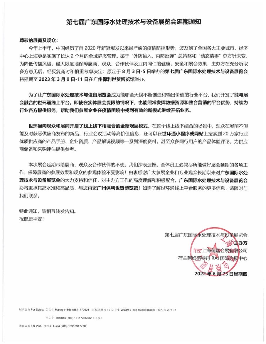 今年上半年,中國經歷了自2020年新冠爆發以來z嚴峻的疫情防控形勢,波及到了全國各大主要城市,經濟中心上海更是實施了長達2個月的全域靜態管理。鑒于“外防輸入、內防反彈”總策略和“動態清零”總方針未變。為降低傳播風險,z大限度地保障展商、觀眾、合作伙伴及業內同仁的健康,安全和展會效果,主辦方在充分聽取多方意見后,經反復商討和慎重考慮決定:原定于8月3日-5日舉辦的第七屆廣東國際水處理技術與設備展覽會將延期至2023年3月9日-11日在廣州保利世貿博覽館舉辦。
