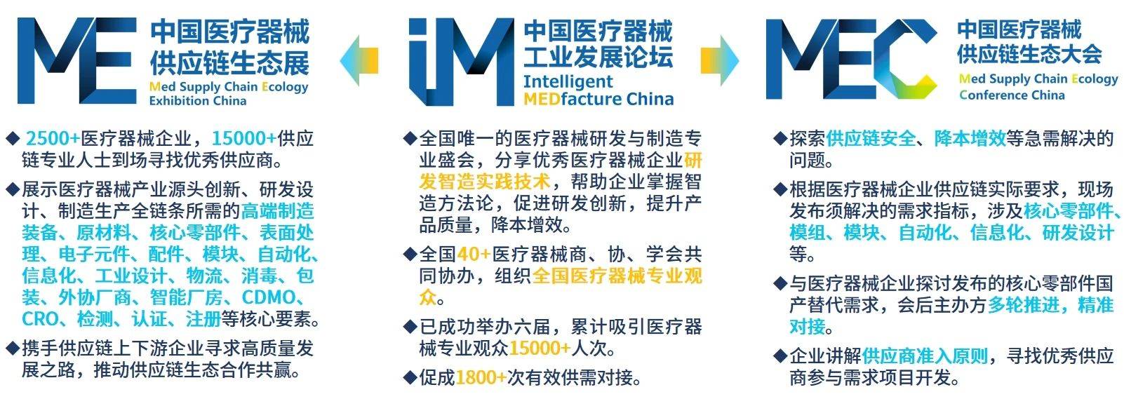 本屆ME供應(yīng)鏈生態(tài)展將以“一展兩會(huì),同期舉行”的創(chuàng)新形式展現(xiàn),同期舉辦中國醫(yī)療器械工業(yè)發(fā)展論壇(以下簡稱IM工業(yè)發(fā)展論壇)及中國醫(yī)療器械供應(yīng)鏈生態(tài)大會(huì)(以下簡稱MEC供應(yīng)鏈生態(tài)大會(huì))。