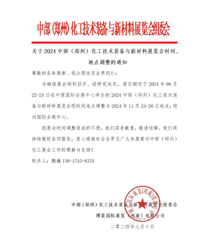 關于2024中部(鄭州)化工技術裝備與新材料展覽會時間、地點調整的通知