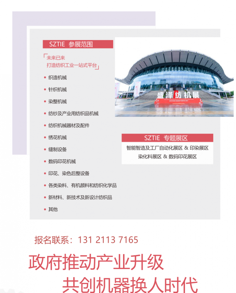 SZTIE2026中國(盛澤)國際紡織機械及印花工業展覽會作為江蘇 地區領先的紡機與印花行業盛會 , 緊跟國際發展趨勢與市場需求 , 專注 傳統紡織制造技術升級和未來紡織開發技術 , 推動企業在該領域的創新 及高速發展 , 是提升國際影響力 、 市場競爭力 、文化傳承力的最佳展示 平臺 。預計將匯聚來自世界各地500余家展商參展 , 吸引20000位專業 觀眾到場參觀。