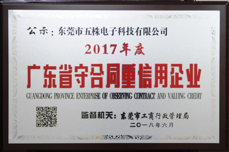 東莞市五株電子科技有限公司榮獲2017年度“廣東省守合同重信用企業(yè)”稱號(hào)