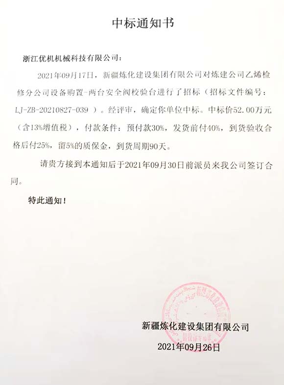 近期,新疆煉化建設集團有限公司發出中標通知書,宣布通知浙江優機機械科技有限公司,二次添加設備購置項目-兩套安全閥校驗臺,經...……全文