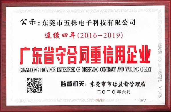 東莞五株連續四年榮獲廣東省“守合同重信用”企業稱號