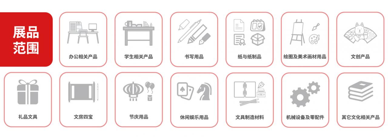全面展示辦公相關產品、學生相關產品、書寫用品、紙與紙制品、繪圖及美術畫材用品、文創產品、禮品文具、文房四寶、節慶用品、休閑娛樂 用品、文具制造材料、機械設備及零配件、其它文化相關產品。
