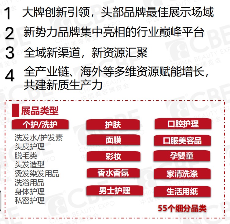 本屆CBE化妝品展將以其恢弘的氣勢震撼登場,展品如繁星般散落于10大展館及數十個主題館之間,恰似一幅絢麗多彩的畫卷徐徐展開。其涵蓋了14大類40多個細分品類,從護膚的水潤滋養到彩妝的明艷動人,從發品的飄逸靈動到護理用品的悉心呵護,無所不包,盡顯美妝世界的豐富多元。這場盛會預計將吸引線上線下全域近五十萬人次的買家紛至沓來,共赴這場匯聚時尚與科技前沿、領銜美妝趨勢的年度狂歡,無疑是一場不容錯過的行業饕餮盛宴。