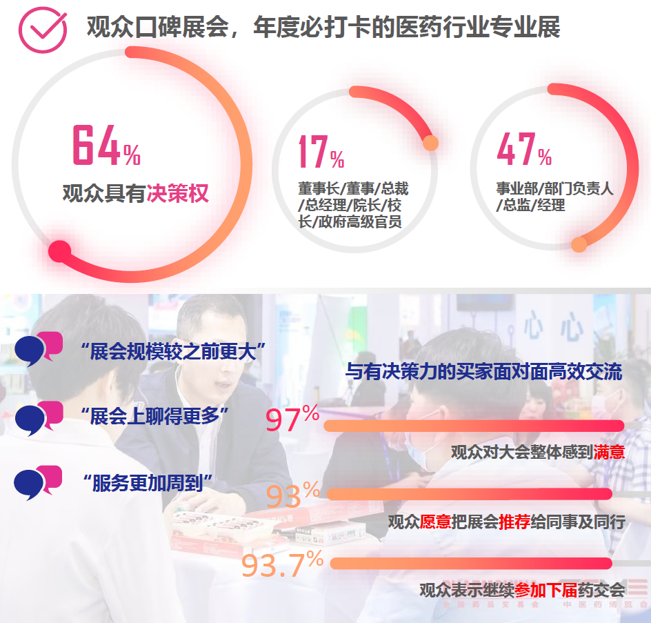 全國藥品交易會(PHARMCHINA)是醫藥制劑與健康領域極具規模和影響力的專業盛會,每年舉辦春、秋兩屆,歷經40余年的不斷創新發展,已成為客戶關系建設、新品發布、商貿合作、洞察趨勢、信息交流、品牌建設、商務社交功能為一體的首選平臺。展示內容涵蓋化學藥、中成藥、中藥材、中藥飲片、藥食同源、生物藥、器械耗材、個人護理、醫美、醫藥研發供應鏈、醫藥物流技術與設備、智慧營銷解決方案、互聯網+等細分產業集群,匯集了覆蓋全國等級醫院、零售藥店、醫藥電商、基層醫療終端等全渠道的專業資源與合作伙伴。