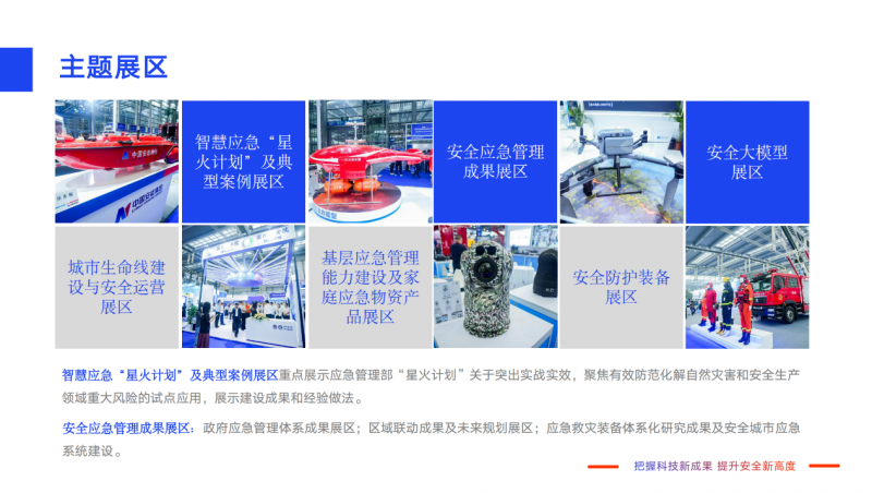 政府應急管理體系成果展區;區域聯動成果及未來規劃展區;應災裝備體系化研究成果及安全城市應急系統建設。