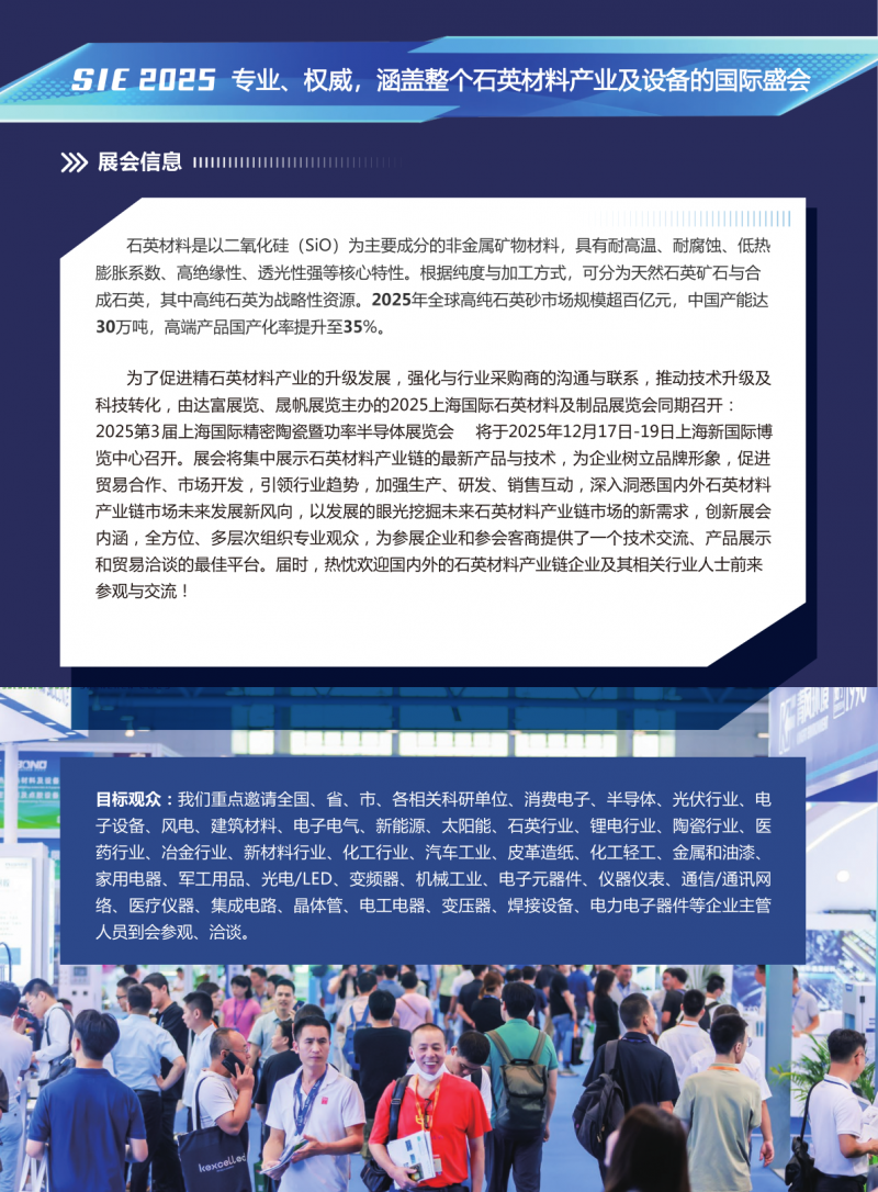 誠摯邀請您蒞臨 2025上海國際石英材料及制品展覽會,本次展會將于 2025年12月17日至19日 在上海新國際博覽中心(浦東新區(qū)龍陽路2345號)隆重舉辦。作為亞太地區(qū)石英行業(yè)的重要盛會,我們將匯聚全球頂尖供應(yīng)商、技術(shù)專家及行業(yè)領(lǐng)袖,共同展示最新產(chǎn)品、技術(shù)與解決方案。
