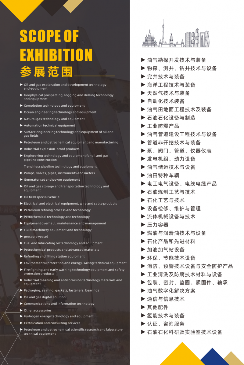油氣勘探開(kāi)發(fā)技術(shù)與裝備,物探、測(cè)井、鉆井技術(shù)與設(shè)備,完井技術(shù)與裝備,海洋工程技,術(shù)與裝備,天然氣技術(shù)與裝備,自動(dòng)化技術(shù)裝備,油氣田地面工程技術(shù)及裝備,石油石化設(shè)備與制造,工業(yè)防爆產(chǎn)品,油氣管道建設(shè)工程技術(shù)與設(shè)備,管道非開(kāi)挖技術(shù)與裝備,泵、閥門、管道、儀器儀表,發(fā)電機(jī)組、動(dòng)力設(shè)備,油氣儲(chǔ)運(yùn)技術(shù)與設(shè)備,油田特種車輛,電工電氣設(shè)備、電線電纜產(chǎn)品,石油煉制工藝與技術(shù),石化工藝與技術(shù),設(shè)備檢修、維護(hù)與管理,流體機(jī)械設(shè)備與技術(shù),壓力容器,燃油與潤(rùn)滑油技術(shù)與設(shè)備,石化產(chǎn)品和先進(jìn)材料,加油加氣站設(shè)備,環(huán)保、節(jié)能技術(shù)設(shè)備,消防、預(yù)警技術(shù)設(shè)備與安全防護(hù)產(chǎn)品,工業(yè)清洗及防腐技術(shù)材料與設(shè)備,包裝、密封、墊圈、緊固件、軸承,油氣數(shù)字化解決方案,通信與信息技術(shù),其他配件,氫能技術(shù)與裝備,認(rèn)證、咨詢服務(wù),石油石化科研及實(shí)驗(yàn)室技術(shù)設(shè)備。