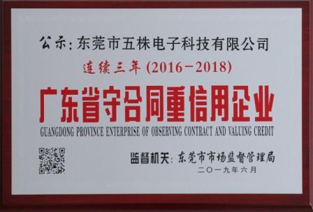 東莞市五株電子科技有限公司榮獲2017年度“廣東省守合同重信用企業(yè)”稱號(hào)