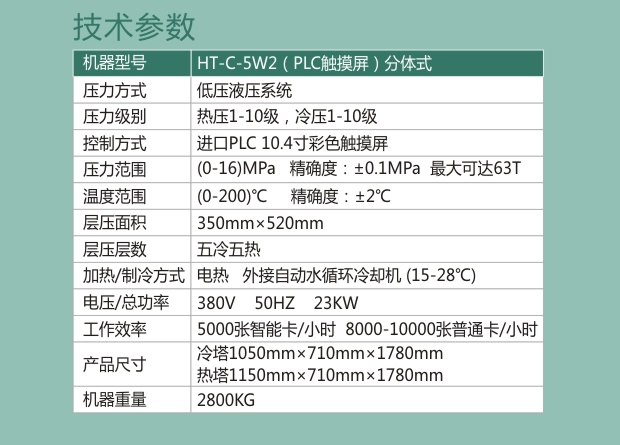 HT-C-5W2 (PLC觸摸屏) 專業型層壓機是針對專業廠家生產RFID,IC,ID芯片層壓而開發的高性能設備。有效控制生產過程中廢品率、難以操作等難題。也是為配套制作二代身份證等高檔證件卡、銀行卡、公交一卡通、高速公路、社保卡等專業制作卡片的公司、卡廠開發的專業PVC智能卡層壓機。